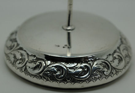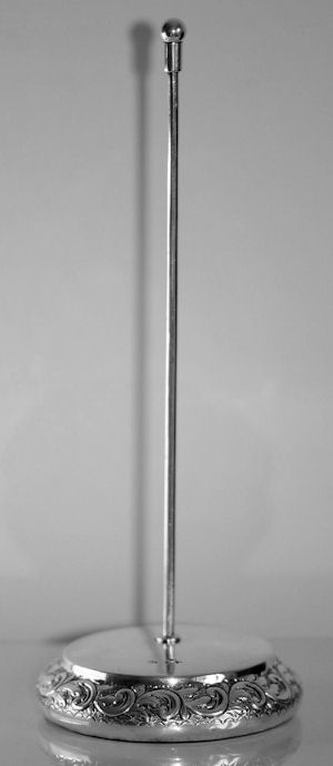 The base is decorated with an embossed acanthus leaf scroll design and the spike has a removable threaded cap that when removed reveals a sharpened point. The base is loaded for extra stability and is covered in a green baize.