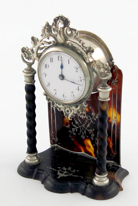 A silver-mounted tortoiseshell clock, by William Comyns, London 1912, circular form, with a pierced foliate scroll pediment, with two carved twisted column supports, tortoiseshell back plate with inlaid decoration, on a shaped base, height 10cm.