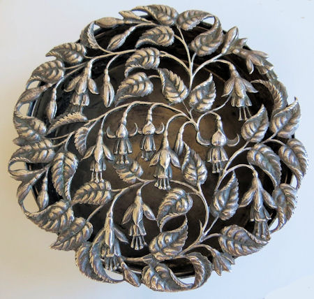 A Charles & Richard Comyns sterling silver round pot pourri box with fuchsia decoration.