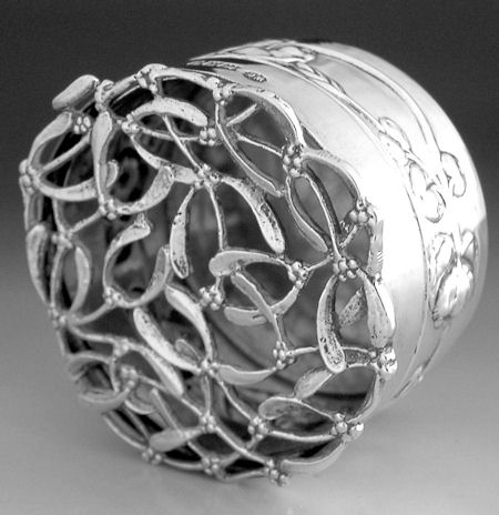 An Edwardian silver pot pourri box with mistletoe decorated cast lid and embossed flower sides.