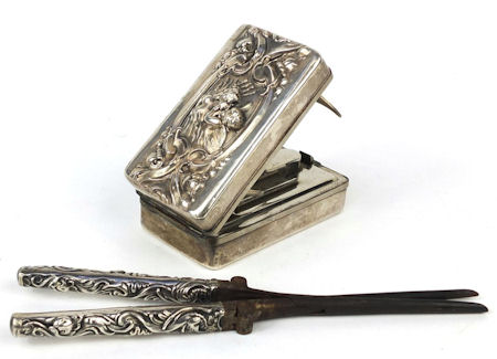 A Pair of silver William Comyns silver curling tongs and stove, London 1902, the curlers 20cm long