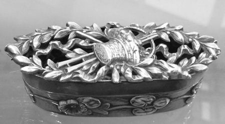 A Silver pot pourri box decorated with Laurel, canes and a basket.