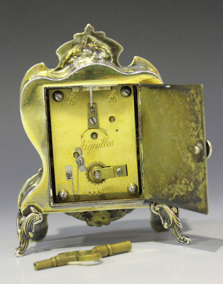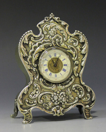 A late Victorian silver gilt cased boudoir clock with French movement and enamel circular dial, the front of the balloon shaped case decorated in relief with foliate scrolls and floral motifs, raised on four scroll feet, London 1888 by William Comyns, height 11.4cm,