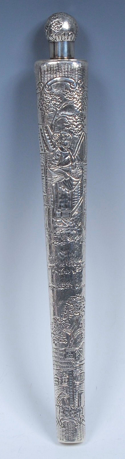 A large Victorian silver tapered scent bottle, profusely embossed with a lady in a rustic farmyard, domed screw-fitting cover, 29cm long, William Comyns, London 1888