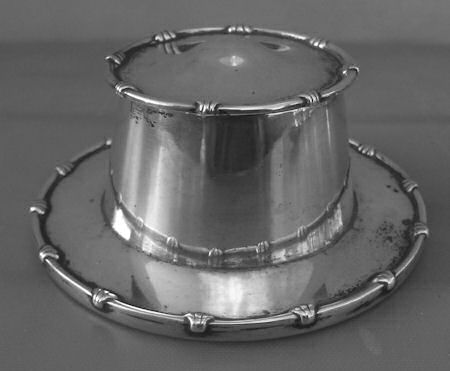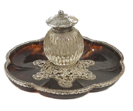 A Victorian Silver and Tortoiseshell Inkwell with a welled and ribbed shaped circular tortoiseshell base applied with an openwork scroll foliate silver band rising to the fixed cut-glass globular inkpot with petal form silver lid, 13.5cm diameter, London 1890.