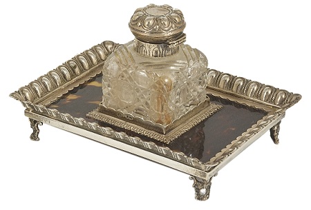 A Victorian Silver and Tortoiseshell Inkwell with a tortoiseshell rectangular base and silver egg and dart border and openwork cast panel feet, the removable cut-glass square inkpot with a bun shaped silver lid similarly egg and dart bordered, 15.5cm long,
