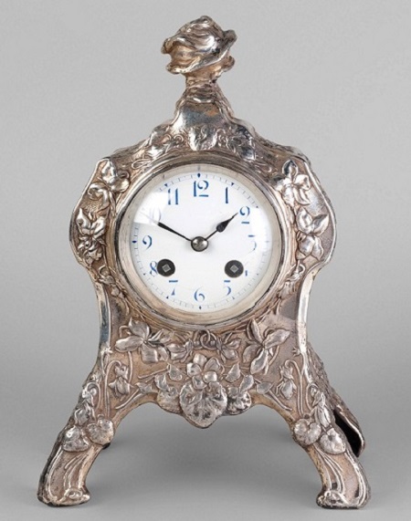 An art nouveau style silver cased mantel clock