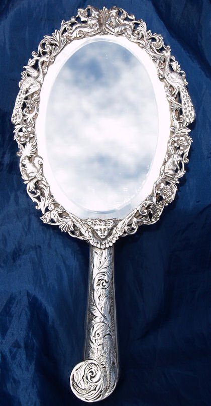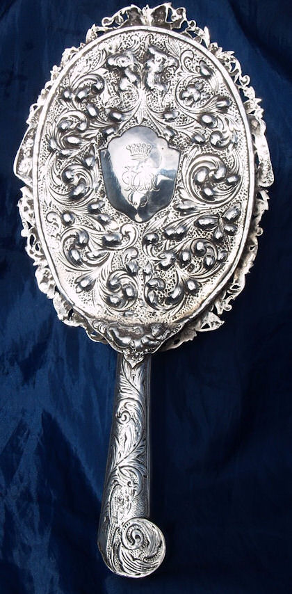 A Cast silver and bevelled glass hand mirror with a pistol grip handle. The cast silver mirror surround decorated with Peacocks, flowers, C scrolls and mythical beasts. Also with an inscribed coronet and the letters IR