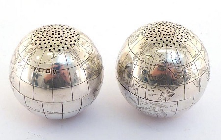 A pair of novelty silver condiments modelled as globes engraved with the continents, by Richard Comyns, London, 1926, 4 cm. diameter, wt. 189 gm. In excellent condition.