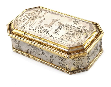rectangular form, canted corners, engraved in the Chinoiserie manner, with figures and birds, the interior with three fitted sections, length 15.4cm, approx. weight 13.1oz.