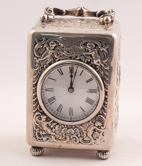 An Edwardian silver cased carriage clock, The white enamel dial with roman numerals; the case decorated with cherubs amongst flowers and foliage. 5″ (12.5)