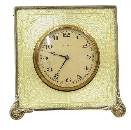 A GEORGE V SILVER AND ENGINE TURNED ENAMEL STRUT CLOCK, William Comyns, London 1928, the circular dial with Arabic numerals within a square case in yellow sunburst enamel on scroll and flowerhead feet, eight day movement. Height 9cm