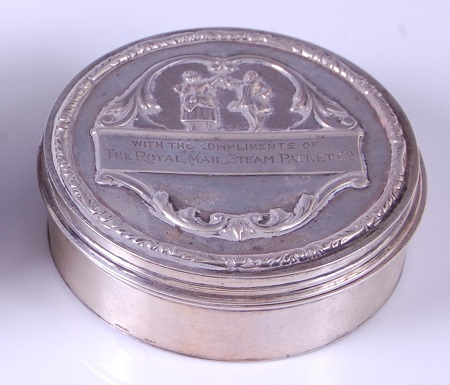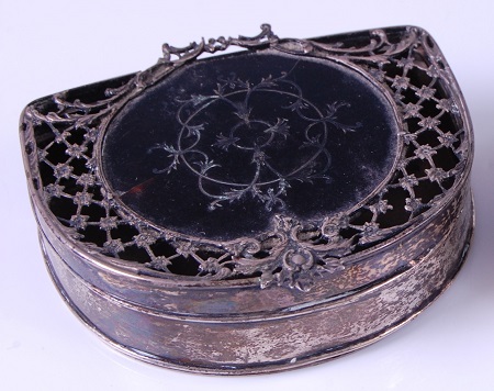 A George V silver trinket box and cover, of semi-circular form, the cover with central tortoiseshell panel with silver pique work, within a further openwork border, maker William Comyns & Sons, London 1913, w.10.5cm; together with a George V silver jar and cover, of circular form, the hinged lid relief decorated with a dancing couple, with tablet below ‘With the compliments of the Royal Mail Steam Packet Co’, maker Elkington & Co, Birmingham 1925, dia.7.5cm (2)