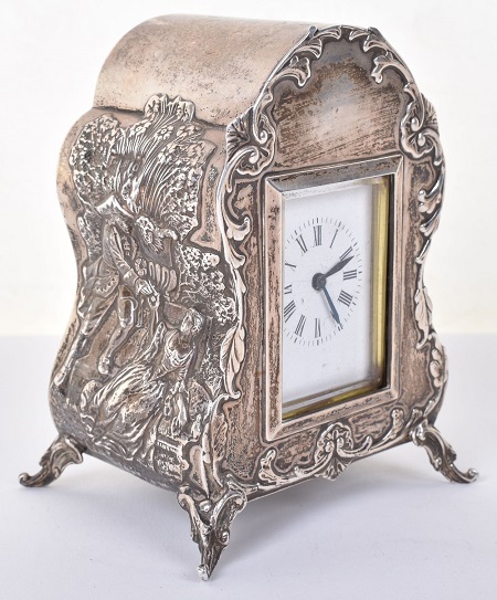 A late Victorian silver cased mantle clock, by William Comyns, London 1899, retailed by Smiths, the case with chase decoration of lovers and foliate-scroll engraving, raised on splayed feet, 12cmH 462.9g total