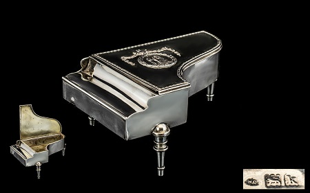 An Edwardian sterling silver trinket box in the form of a grand piano, Makers Mark for William Comyns. Hallmark London 1905. Silver Weight 333.6 grams. Size 6.5 Inches – 16.25 cm long, 3 Inches – 7.5 cm