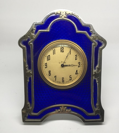 A silver and enamel desk clock by Charles and Richard Comyns , London, of strut form the arched shape frame with leaf detail blue guilloche enamel ground the dial with Arabic numerals 11cm by 7.5
