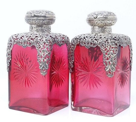 A pair of Victorian silver overlay cranberry glass spirit decanters, with pierced shoulders and relief embossed floral flower and butterfly decoration, by William Comyns, hallmarks London 1893, height 16.5cm