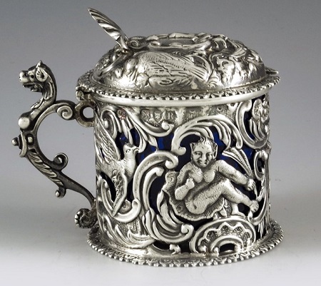 William Comyns, London 1892, a Victorian silver mustard pot, reticulated and embossed in relief with imps, birds and green man within a C scroll ground, cast seahorse handle and shell thumb piece, glass liner, 7cm high, 2.55ozt