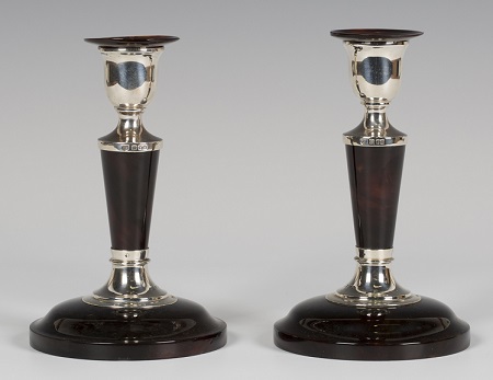 A pair of George V silver and tortoiseshell candlesticks, each silver urn shaped sconce with detachable tortoiseshell nozzle, on a tapering stem and circular foot, London 1933 by William Comyns & Son Ltd, height 13.2cm.