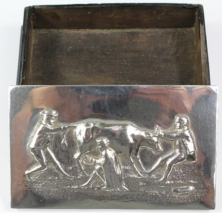 An ebony box with a cast silver lid featuring a farmyard scene of three people milking a cow.