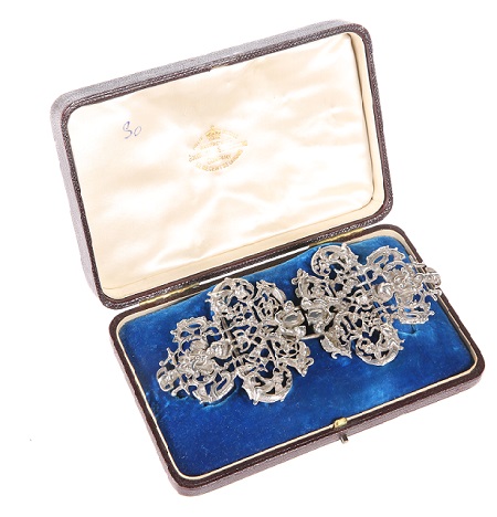 A silver belt buckle in a fitted Goldsmiths and Siversmiths case.