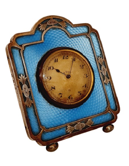 An early 20th Century hallmarked silver and enamel decorated easel clock, Arabic numerals to a circular dial within an overlaid silver blue guilloche enamel ground, all terminating in twin bun feet, height 12cm, London 1926, William Comyns & Sons Ltd.