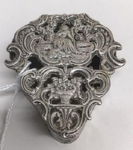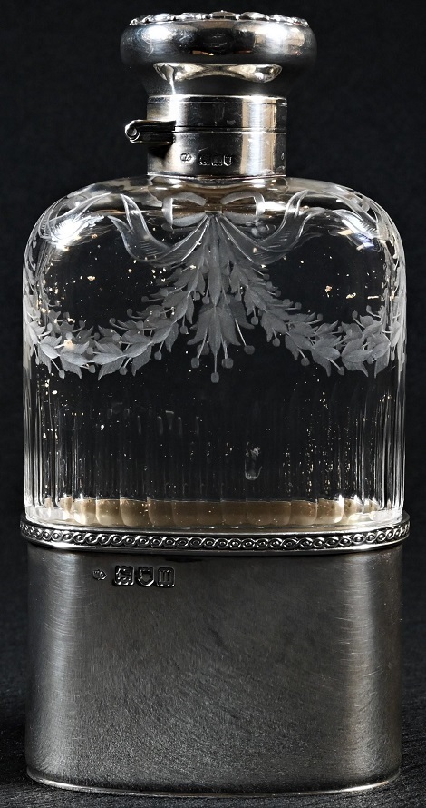 An Edwardian silver, tortoiseshell and pique mounted hip flask, hinged bayonet cover inlaid in the neo-classical taste, the shoulder etched with a band of ribbon-tied bell-husk swags, stirrup cup to base, 14cm high, William Comyns, London 1907
