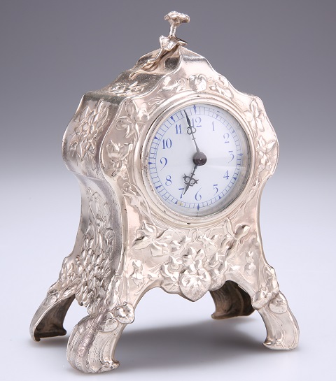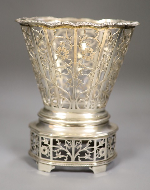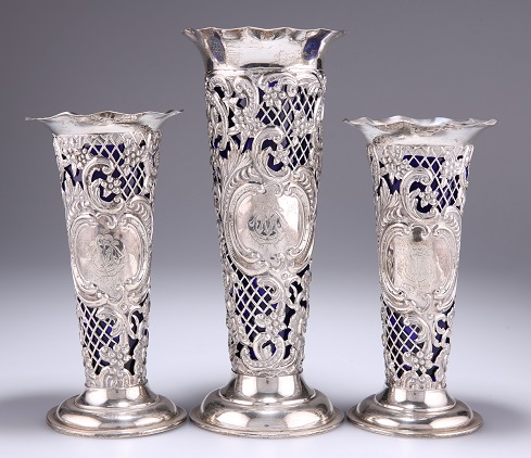 A GARNITURE OF THREE VICTORIAN SILVER VASES, by William Comyns & Sons, London, the larger vase 1897, the pair 1899, each pierced sleeve with undulating out-turned rim and embossed with trellis, scrolls and foliage, each engraved with a monogram and with blue glass liners. Larger vase 23cm high, gross weight of silver 16 troy ounces