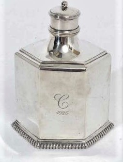 An Edwardian silver tea caddy of hexagonal form, in the early Georgian style, with slip on cover, and gadrooned bordered base (London 1904). William Comyns. All at approximately 8ozs. 13cm overall height.
