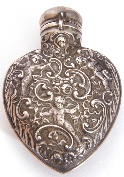 A William Comyns silver heart shaped perfume flask/smelling salt, London 1898, typically decorated with cherubs and scrolls on both sides, domed hinged lid with internal glass stopper, 8 x 5.5cm