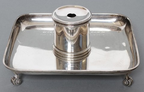A silver desk inkstand, maker Charles & Richard Comyns, London 1921, of plain dished rounded square form raised upon four knurl feet, centred by a deep rounded well surmounted by a lift-off cylindrical ink-pot, the cover with pierced roundel, base engraved with a stag and presentation inscription dated 1944, 7 3/4″ square, 18ozs 3dwts total