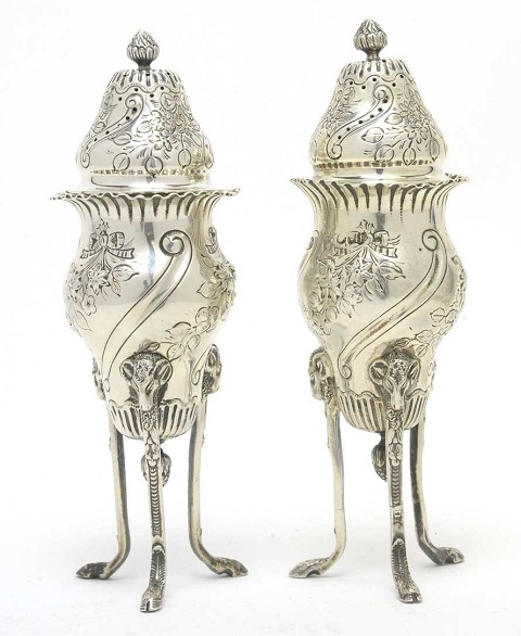 A pair of Victorian silver sugar casters, by William Comyns, London 1892, with acorn finials above flower and bow decorated pierced cover and baluster body, raised on rams head and hoof pattern legs, 20cms high, 11.9oz. gross