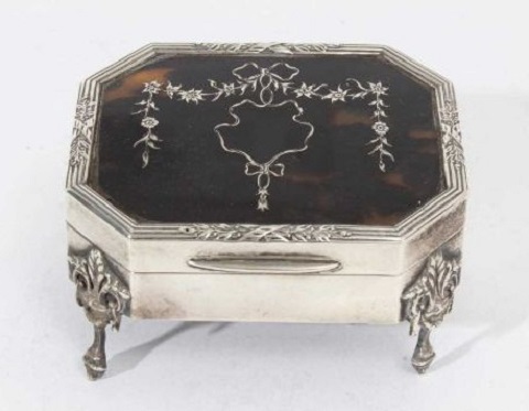 A George V silver jewellery/trinket box of octagonal form, with reeded border, and tortoiseshell piquet work decoration to hinged lid, with velvet interior, on four decorative feet (London 1912). William Comyns, 9cm across.