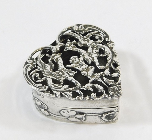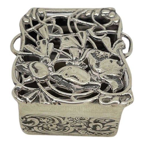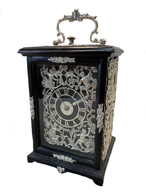 A wooden cased victorian carriage clock, the sides, door, top and spandrels of applied cast and pierced silver, mark of William Comyns & Sons, London 1885, featuring scrollwork and classical scenes, the dial with pierced silver coloured Roman numerals and spade hands, key wind 8 day movement striking on a going with decorative (non-functional) ‘repeater’ button, double scroll swing handle, 13.5cm in height with the handle down