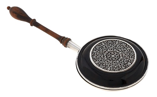 A George V silver and tortoiseshell pot pourri bowl in the form of a miniature warming pan, with finely turned wood handle and intricately pierced lid, 22cm l, maker’s mark rubbed, probably Charles and Richard Comyns, London 1916 and stamped A6839