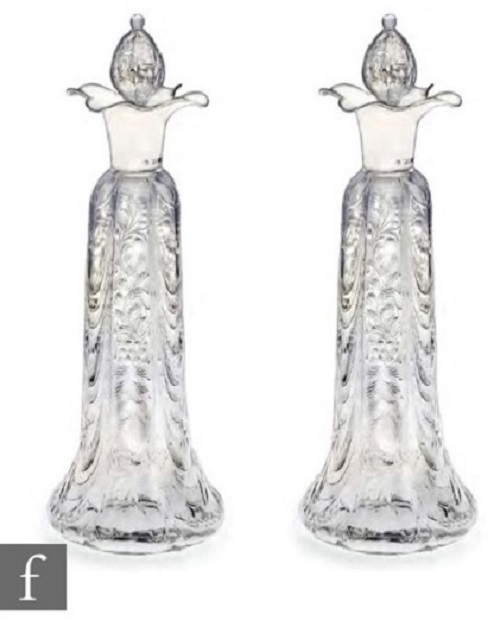 A pair of Art Nouveau Thomas Webb & Sons decanters, circa 1901, of tapered form decorated with intaglio cut with floral motifs and panels of swags and polished beaded festoons, with hallmarked silver collar, and matching hollow blown stoppers, William Comyns & Sons, London, 1901, height 34cm.