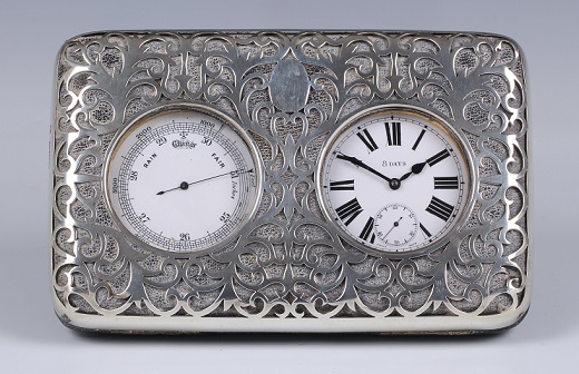 An Edwardian silver mounted desk barometer and clock, William Comyns, London 1902, with a chrome plated pocket barometer and a nickel plated goliath pocket watch, with Roman enamel dial with subsidiary seconds, gilt three quarter plate Swiss lever movement, housed in a leather case with easel back and a pierced silver, foliate scroll mount, 7 x 4¾ x 1½in. (17.8 x 12.1 x 3.8cm.)