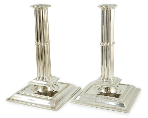 A large pair of George V silver cluster column candlesticks, by William Comyns & Sons Ltd, on broad square bases, London, 1935, height 30.6cm, 67oz.