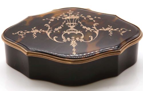 An Edwardian 9ct gold tortoiseshell hinged trinket box, by William Comyns & Sons, of serpentine form. Inlaid gold giardinetti and swag decoration, with a redded gold applied edge and hinges, London 1909. 107mm x 73mm, 67.75g