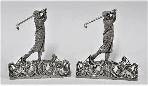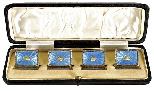 A CASED SET OF FOUR SILVER GILT AND BLUE GUILLOCHE ENAMEL MENU HOLDERS of rectangular form on plain bases with gilt swimming swan centres enclosed within decorative leaf-edged ribbed frames, weight 66g gross, maker William Comyns & Sons Ltd. London 1913-14