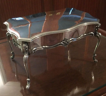 An Edwardian solid silver jewellery box of very large proportions in the form of a Georgian side table with serpentine edges, scrolling motifs standing on four ornate cabriole legs and fully hallmarked for London 1902 by fine silversmiths William Comyns.