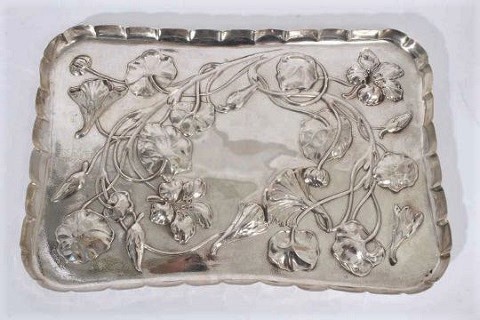 An Edwardian Art Nouveau silver tray of rectangular form, with scalloped border and raised Nasturtium floral pattern decoration, Rd 374012 (London 1905). William Comyns. All at approximately 10ozs. 29cm across.