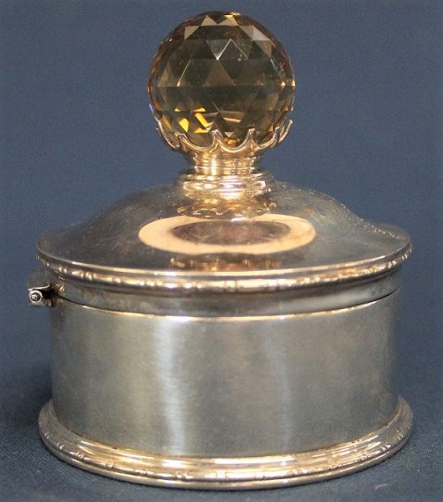 An Edwardian circular silver box with hinged cover and hand cut finial – possibly a smoky quartz held in a claw mount, makers mark W C – possibly William Comyns, London 1909, 7cm dia