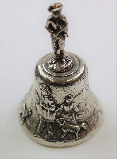 A Late Victorian silver hand bell, the handle modelled as a country boy with violin, the body with cast scene depicting figures, dogs and buildings, hallmarked William Comyns & Sons, London 1897, height approximately 12cm