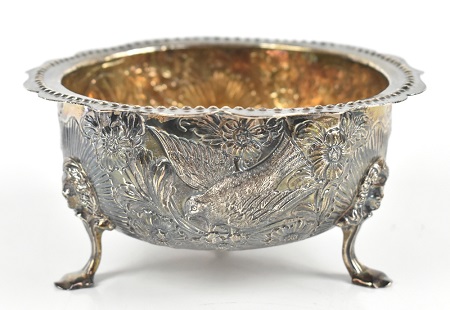 A Victorian hallmarked silver bowl of circular form, with repoussé decoration depicting exotic birds and floral sprays, on three mask head feet, London 1897, diameter 13cm, approx 7.28ozt/226.4g.