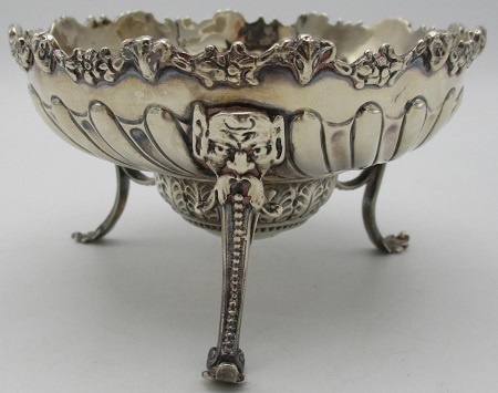A Victorian silver footed sweetmeat dish by William Comyns & Sons, London 1886, with floral swags and rams head rim above a reeded body, raised on three legs with masks and acanthus feet,