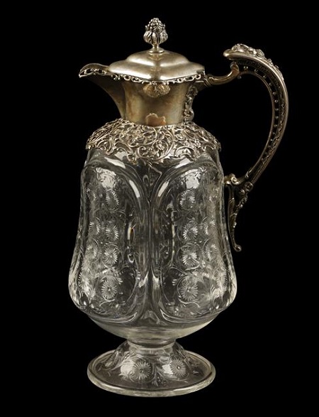 maker’s mark rubbed, probably by William Comyns, London 18leaf and ball finial, hinged cover with pierced scroll border, engraved “To Waldorf from John 19th May 1900”, scroll handle, mount embossed with putto, scrolls, flower heads and spume, pierced scroll girdle, open-work mount with similar decoration, lobed glass body with scroll and flower head decoration, height 28cm.