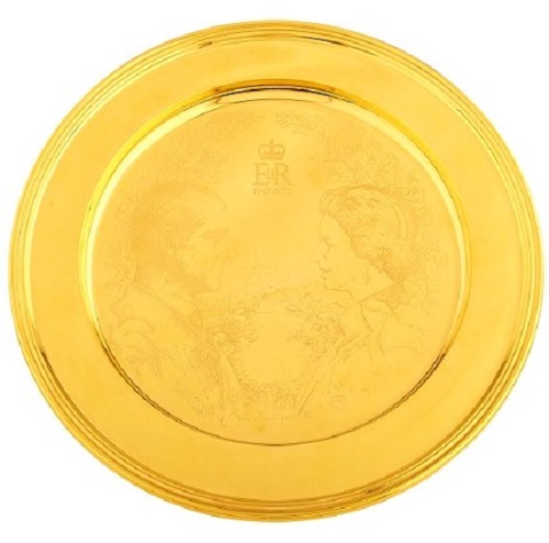 An 18ct gold plate commemorating the silver wedding of Queen Elizabeth II and Prince Philip, with engraved portraits and dates, numbered to the reverse 21.