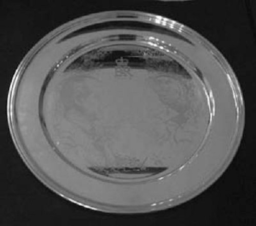A silver plate commemorating the anniversary of the silver wedding of Queen Elizabeth II and Prince Philip with engraved portraits and dates.