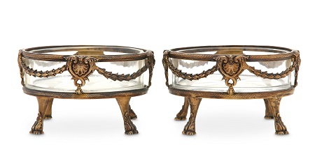 In the Neoclassical taste. Each of oval form with openwork sides with rope twist rims and scallop shells within an acanthus scroll cartouche adjoined by swags, each raised on four legs with classical paw feet. Each with a fitted clear glass liner with star cut base. (2)